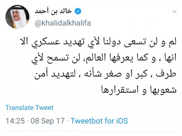جن جنون دول العزل التي تنطّع من بينها وزير خارجية البحرين السابق خالد آل خليفة على "تويتر"، ليكذّب أمير الكويت، قائلا «يعلم سموّه أن التصعيد العسكري لم يأت من الدول التي قاطعت قطر». ثم عاد مغرّداً بصيغة أخرى بدا فيها غضب من هم فوقه « لم ولن تسعى دولنا لأي تهديد عسكري، إلا أنها وكما يعرفها العالم، لن تسمح لأي طرف كبر أو صغر شأنه لتهديد أمن شعوبها واستقرارها».