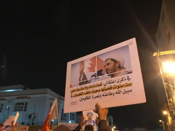 ورفع المتظاهرون صورا لأمين عام الوفاق ورددوا شعارات تطالب بالإفراج الفوري عنه.