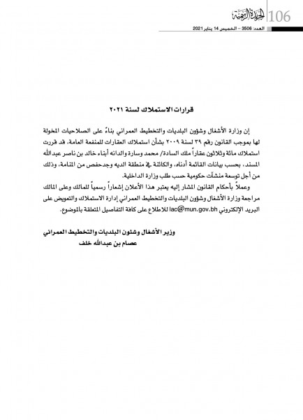 وأشار القرار إلى أن الاستملاك جاء "من أجل توسعة منشآت حكومية حسب طلب وزارة الداخلية"، داعيا الملّاك إلى مراجعة إدارة الاستملاك والتعويض للاطلاع على التفاصيل المتعلقة بالموضوع.