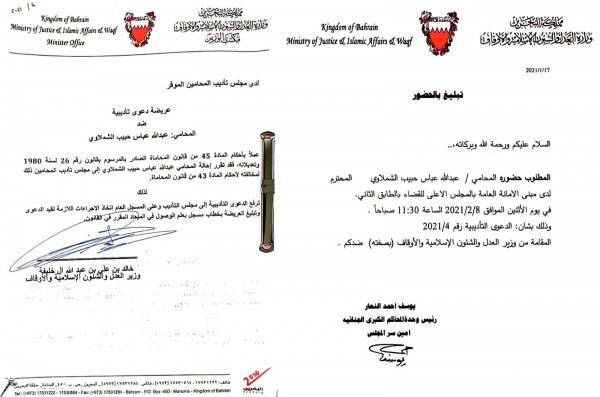 وقال الوزير في رسالة حصلت مرآة البحرين على نسخة منها إنه تقرر "إحالة المحامي عبدالله عباس حبيب الشملاوي إلى مجلس تأديب المحامين ذلك لمخالفته المادة 43 من قانون المحاماة".