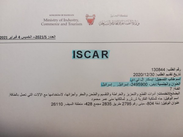 وقد حصلت مرآة البحرين على نسخة من أحد السجلات التجارية التي منحتها وزارة التجارة لشركة إسمها إسكار إل تي، وصاحبها شخص يحمل الجنسية "الاسرائيلية". وكذلك إسم الوكيل وهي شركة جاه للملكية الفكرية ومقرها منطقة السيف.