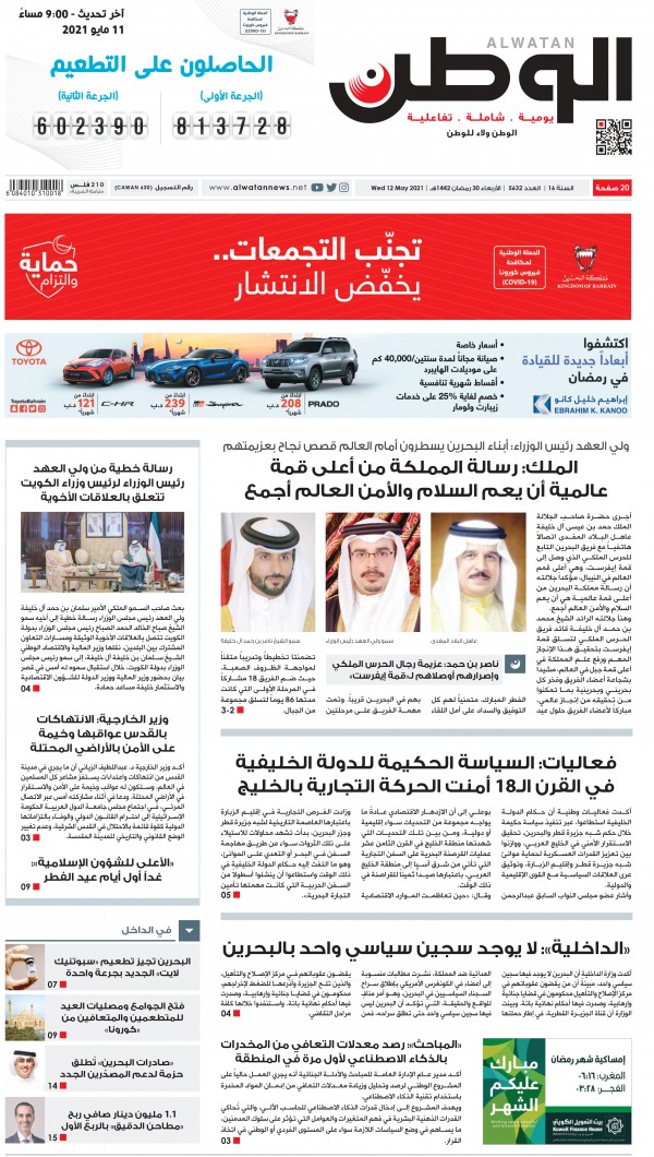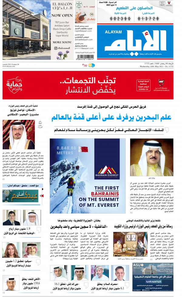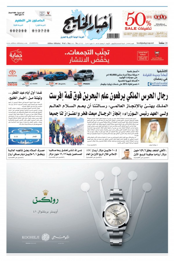 حتى صحيفة "أخبار الخليج" وهي من أقدم الصحف البحرينية ولطالما قدّمت نفسها بأنها صاحبة توجّه عروبي قومي مكرّس لقضايا الأمة العربية فقد خلت صفحتها الأولى من أيّ تفاعل ولو شكلي مع ما يجري فلسطين. جاء في عنوانها الرئيسي ليوم الأربعاء 12 مايو/ أيار 2021 والذي احتلّ مساحة ستة أعمدة "رجال الحرس الملكي يرفعون علم البحرين فوق قمة إفرست".