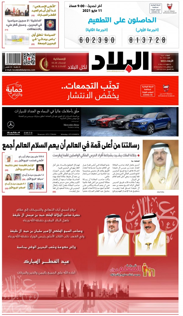 الأمور ليست أفضل حالاً في صحيفة "البلاد" المحلية التي لم تحلق بعيداً عن سابقاتها. جاء في عنوانها الرئيسي على مساحة سبعة أعمدة "رسالتنا من أعلى قمة في العالم أن يعم السلام العالم أجمع". وهو عبارة عن تصريح للملك حمد بن عيسى آل خليفة احتفالاً بوصول الفريق الرياضي إلى قمة "إيفرست". ومثل شقيقاتها فقد تجاهلت تكريس أية مقاربة أو أيّ تطرّق من قريب أو بعيد إلى تطورات المشهد الفلسطيني.