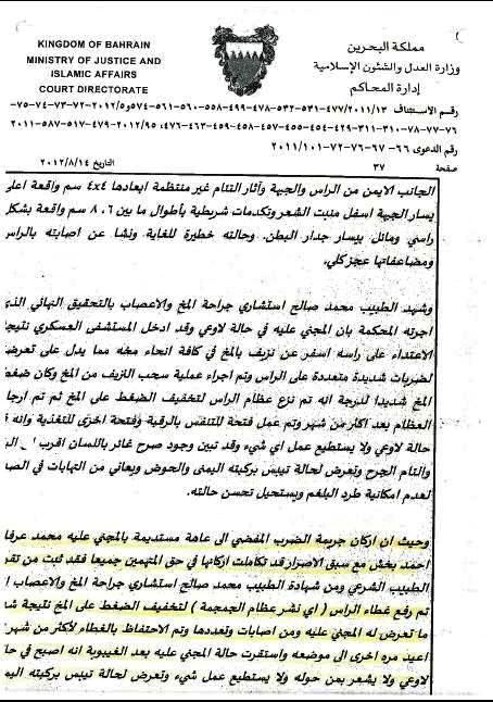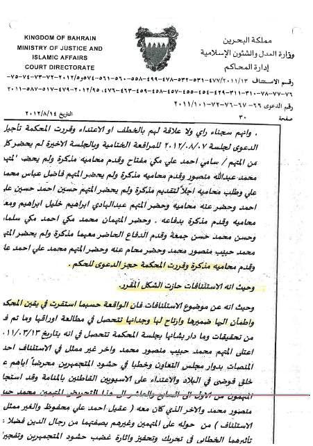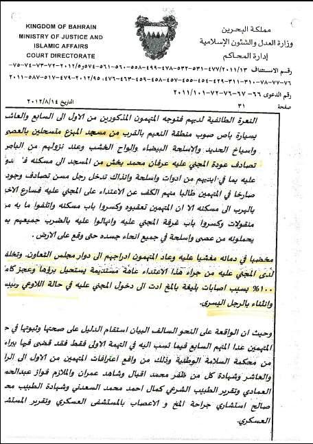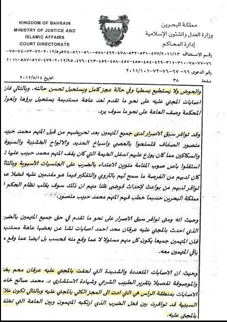وقال إن دفاع المتهمين يرون أنهم يستحقون البراءة، وأن شهود الدفاع الذين حرموا من تقديمهم يؤكدون أن المغمى عليه بالمستشفى العسكري قد سقط من أعلى "الدرجات الحديدية" أثناء عمله، وأنه لا يسكن في المنامة بحسب سجلات هيئة تنظيم سوق العمل المرفق نسخة من بياناته الشخصية فيها بملف القضية .