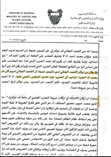 وفيما يتعلق بكذبة استهداف المجني عليه لكونه مؤذنا سنيا، فقد حذفها الحكم من أسبابه بقوله في صفحة ٣٨ أن المتهمين "استقلوا باصا صوب المنامة منوين الاعتداء بالضرب على الجنسيات الآسيوية". وعليه فلم يكن استهداف المجني عليه لكونه مؤذنا سنيا أو لقطع لسانه بل جاء الاستهداف عاما وبنية الضرب، على فرض صحة الواقعة.
