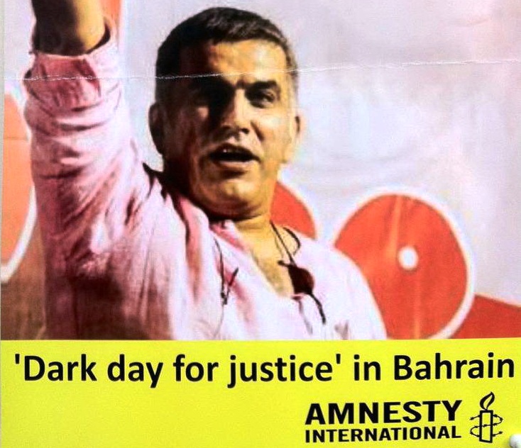 مرآة البحرين: وزعت منظمة العفو الدولية «أمنستي» ملصقاً للمطالبة بإطلاق سراح الناشط رئيس مركز البحرين لحقوق الإنسان نبيل رجب الذي يقضي عقوبة بالسجن 3 سنوات بسبب تغريدات على «تويتر». وكتب على الملصق الذي تتوسطه صوره لرجب «يوم أسود للعدالة في البحرين».