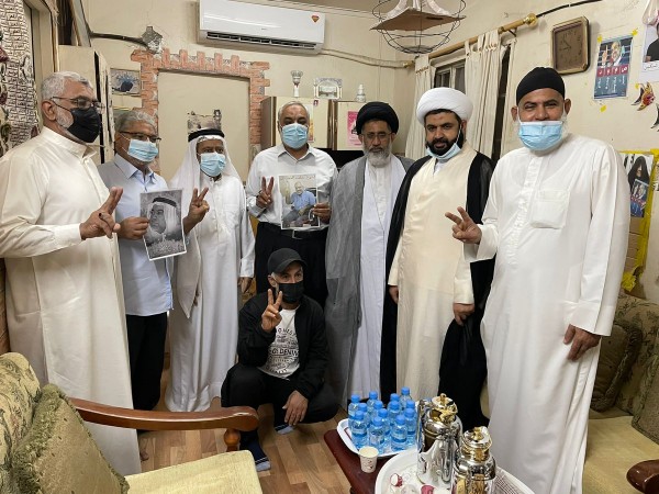 قيادات دينية وعوائل الشهداء خلال زيارة تضامنية لمنزل الأكاديمي المعتقل عبدالجليل السنكيس