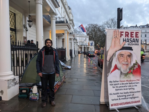 The organization said via its Twitter account "CAAT stands in solidarity with Ali Mushaima as he reaches his 13th day on hunger strike in front of the Bahraini Embassy highlighting the cases of political prisoners Dr. Al-Singace and his father Hassan Mushaima."