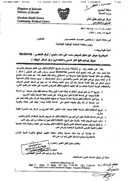 وثيقة من مركز كانو الصحّي تثبت وجود الشهيد محمد مشيمع بالمركز في توقيت أحداث المرفأ المالي