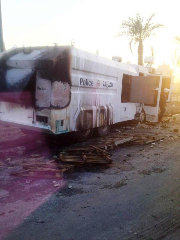 واصطدمت إحدى دوريات الأمن المسرعة، فوق الكوبري المطل على دوار اللؤلؤة، بسيارة مدنية مسببة فيها أضرار بليغة جدا، كما اصطدمت مدرعة المياه التابعة للداخلية بسور حديدي وهي تحاول تفريق المتظاهرين مدعومة بمئات من عناصر المرتزقة، وتسبب هذا الحادث بسيطرة المتظاهرين عليها، وقام أحد المحتجين بخلع صنبور الماء في المدرعة منعا لاستخدامها ضد المتظاهرين.