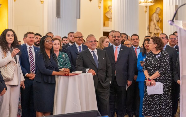 ولي العهد خلال حفل الاستقبال الذي نظمه عمدة الحي المالي لمدينة لندن، ووزيرة الدولة للأعمال والتجارة بالمملكة المتحدة مع كبرى الشركات البريطانية
