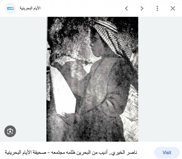 ناصر بن جوهر بن مبارك الخيري (1876-1925) من مؤسسي نادي "إقبال أوال" بالمنامة 1913، و"النادي الأدبي" 1920 بالمحرق. نقله (ديلي) إلى دار الحكومة موظفا في قسم القضايا الخاصة بالقضاء المدني من 1921-1924. يعتبر من أوائل المثقفين الخليجيين، وله مراسلات أدبية وفكرية مع مشاهير عصره. يصنف اجتماعيا من فئة (الموالي)-موالي العيونيين أمراء الأحساء السابقين- وقد استعان بالعلم والثقافة كمصدر قوة بدل النسب القبلي، وترك لنا كتابه المهم (قلائد النحرين في تاريخ البحرين) الذي طبع لأول مرة في 2003.