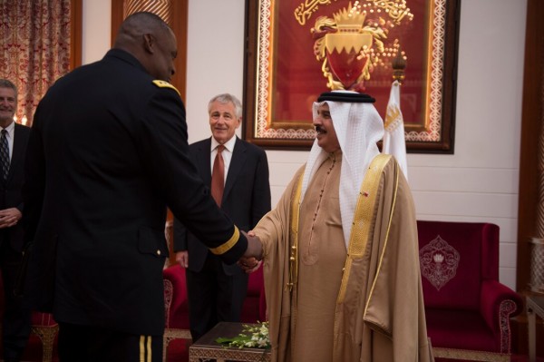 مصافحة بين ملك البحرين ووزير الدفاع الأمريكي في المنامة