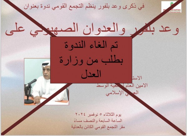 منعت وزارة العدل والشؤون الإسلامية والأوقاف ندوة سياسية كانت جمعية التجمع القومي الديمقراطي تنوي إقامتها في ذكرى وعد بلفور.