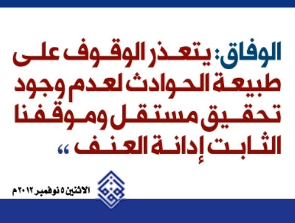 وأضافت "الوفاق"، في بيان اليوم الإثنين، أن "موقفنا المبدئي والثابت من رفض العنف يدعونا إلى إدانة هذه الحوادث حال حدوثها أياً كانت الجهة التي تقف خلفها"، مجددة المطالبة "بوجود جهات مستقلة للتحقيق في هذه الحوادث المزعومة والحوادث التي قبلها، وفتح الباب لوجود جهات إعلامية وحقوقية ذات مصداقية للمساهمة في تقديم الحقيقة إلى الرأي العام".
