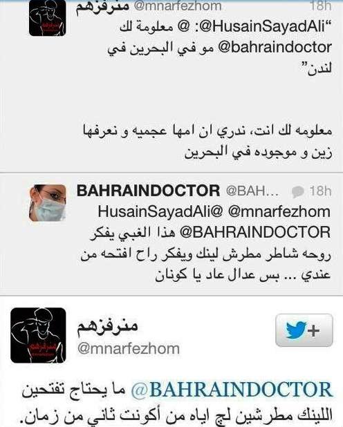 Bahrain Mirror (exclusive): the twitter account "@mnarfezhom" of Mohammed bin Salman bin Saqer Al Khalifa (a member of the ruling family in Bahrain) has entered on the line of threats and intimidation faced by the Bahraini doctor with the famous account "@BAHRAINDOCTOR" onTwitter network.