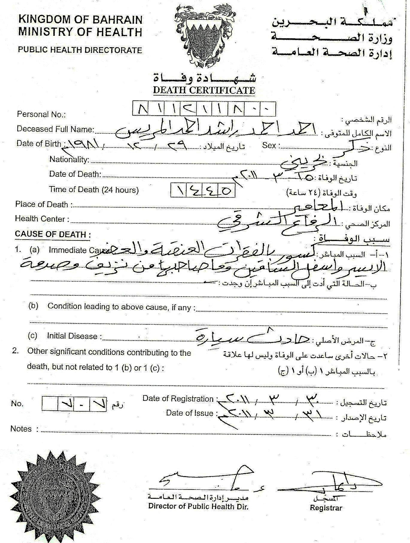 كيف يموت الشرطي المريسي في أماكن ثلاثة؟ المعامير (شهادة وزارة الصحة)، دوار مجلس التعاون (كتّاب الصحف الرسمية)، وبعد شهر وأربعة أيام تختار زارة الداخلية منطقة (سترة)؟ وكيف ينقل المصاب بالحادث إلى مستشفيين: الرفاع الشرقي حسب (شهادة الوفاة)، ومستشفى قوة الدفاع حسب (تقرير بسيوني)؟ وهل يمكن أن يقتل شرطي وينقل إلى مركز صحي (مدني) وليس إلى مستشفى (عسكري) مثل قوة الدفاع البحرين؟ وهل يمكن أن يموت الضحية في توقيتين مختلفين الساعة 14:45 ( شهادة الوفاة ) والساعة 13:4 (تقرير بسيوني)؟