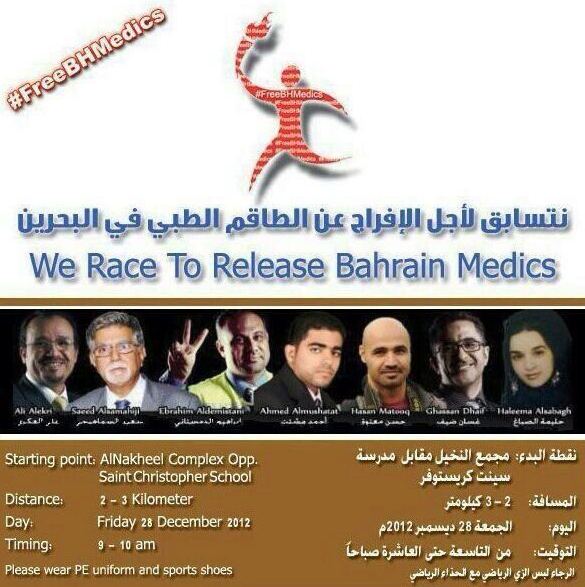 مرآة البحرين (خاص): ينظم ناشطون بحرينيون فعالية رياضية تحت شعار "نتسابق لأجل الإفراج عن الطاقم الطبي في البحرين" وذلك بعد غد الجمعة من الساعة التاسعة حتى العاشرة صباحاً، والتي ستنطلق من "مجمع النخيل" مقابل مدرسة "سانت كريستوفر".