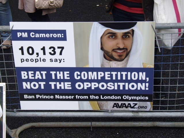 وكاد سباق "فورمولا 1" أن يلغى في البحرين للعام الثاني على التوالي، بضغط من هذه المنظمات وغيرها، ورغم أنه أقيم إلا أن ضجة دولية كبيرة صاحبت ذلك، ما ضاعف الحرج على النظام. ودشنت منظمة "آفاز" عريضة لمنع دخول نجل الملك ناصر بن حمد إلى المملكة المتحدة خلال "أولمبيات لندن".