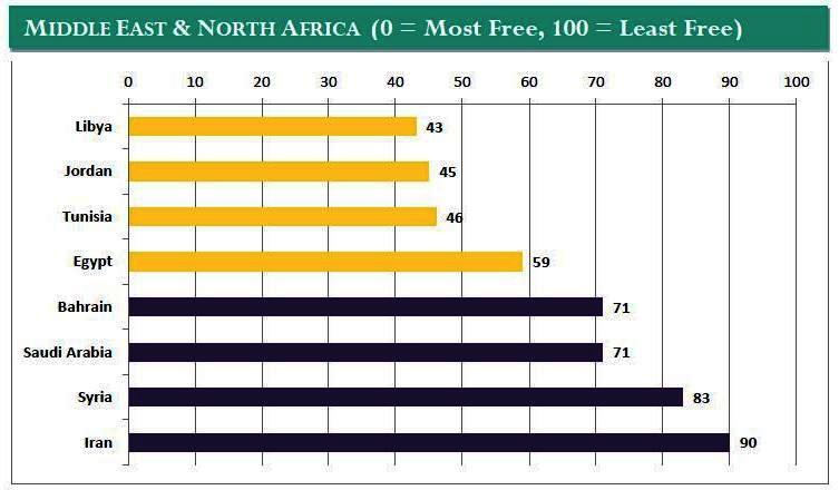حلّت البحرين "ضمن أكثر دول العالم تدنيا في مستوى حرية الصحافة" بحسب تقرير لمنظمة "فريدوم هاوس"، وذلك في المرتبة 182 عالمياً، من أصل مسح شمل 197 دولة. وخلص التقرير إلى أن "البحرين وسوريا يعانيان من تراجع حاد في حرية الصحافة في ظل الحملات القمعية للحركات الاحتجاجية".