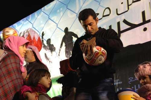قد تختصر هذه الصورة كل شيء:علاء حبيل يوقع كرات تذكارية لأطفال المعتقلين والشهداء