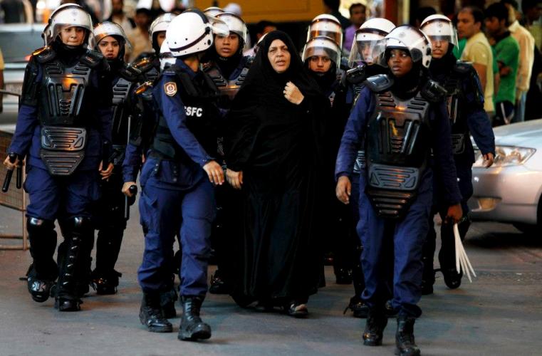 في غضون ذلك، عمل النظام أيضًا على الاستفادة من قوّاته النسائية، وجعلهن ينخرطن في مواجهة علنيّة مع النساء المُناضلات وجهًا لوجه، وبحُكم التربية الأمنية المُوحَّدة والقائمة على سياسة تحطيم الخصم كُلّيًا، دون الاعتبار لأي وضعٍ قانوني أو أخلاقي، عمِلتْ قوّات مُكافحة الشغب النسائية على إجادة دورهن، من خلال إعادة تمثيل مشاهد سجن أبو غريب، السيء الصيت، وأفاق العالم على صور المُعتصِمات، في مجمع الستي سنتر، وهنَّ مُكدّسات فوق بعضهن البعض، وسط شماتة علنية، وقسوة لم تخفِها تقاسيم وجوه تلك النسوة، المُجنّدات أصلًا من أصولٍ وافدة، ومن أعراق لا تمتّ إلى البحرين بصلة.