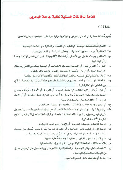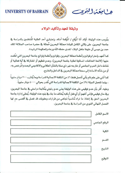 توقيعات يمتنع الطلبة والطالبات بموجبها عن "ممارسة أية نشاطات ليست أكاديمية حتى وإن كانت خارج الجامعة" حسبما تشير إلى ذلك الوثيقة المسربة.
