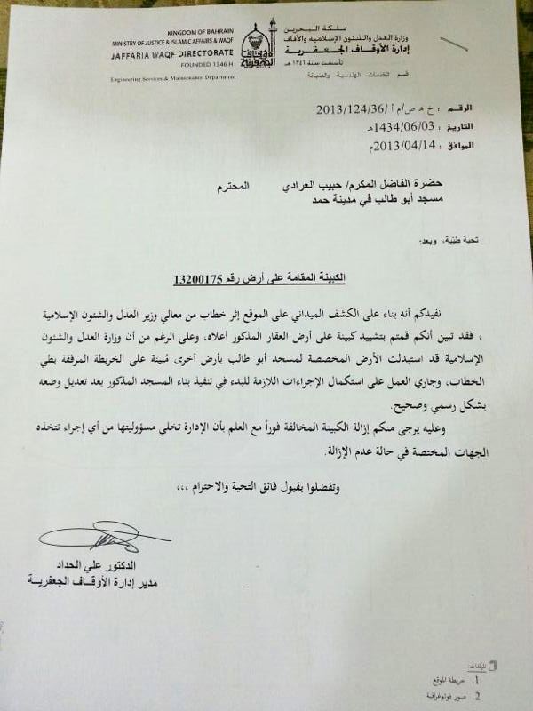 وجاء في الرسالة الموقعة من مدير إدارة الأوقاف الجعفرية الدكتور علي الحداد والتي حصلت «مرآة البحرين» على نسخة منها «نفيدكم أنه بناء على الكشف الميداني على الموقع، إثر خطاب من وزير العدل، فقد تبين أنكم قمتم بتشييد كبينة على أرض العقار المذكور أعلاه (مسجد أبو طالب)»، مضيفة بأن «وزارة العدل قد استبدلت الأرض المخصصة لمسجد أبو طالب بأرض أخرى مبينة على الخريطة المرفقة في الخطاب».
