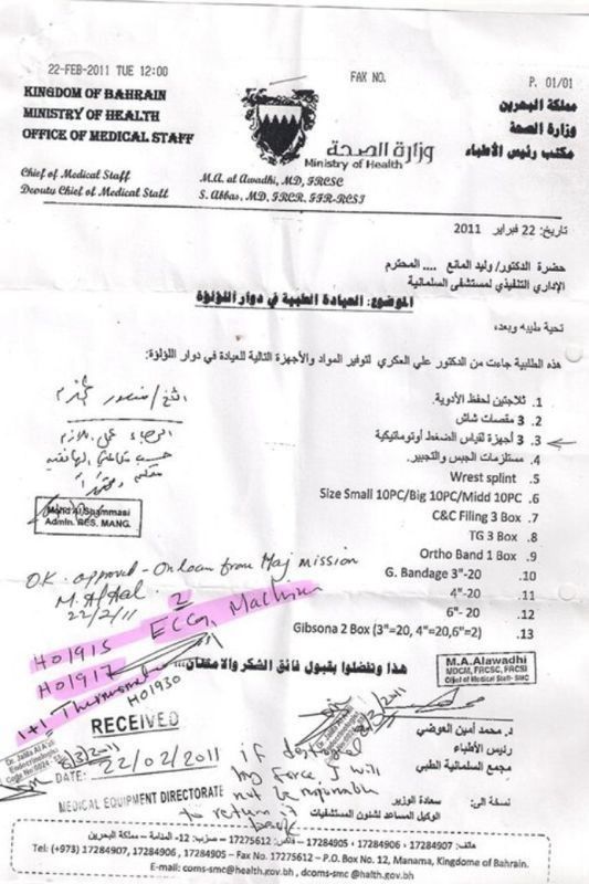 وهو الأمر الذي يتنافى مع ادعاءات وزيرة الصحة فاطمة البلوشي وعدد من الوسائل الإعلامية التابعة إلى السلطة من أن المتظاهرين بمعاونة الأطباء قاموا بسرقة المستلزمات الطبية من المستشفى وتهريبها إلى دوار اللؤلؤة. وتظهر الوثيقة استلام وزير الصحة والوكيل المساعد لشئون المستشفيات نسخة منها، ما يعني موافقتهما على تزويد الدوار ببعض مستلزمات الإسعافات الأولية. هذا وتنشر "مرآة البحرين" نسخة من الوثيقة التي حصلت عليها.