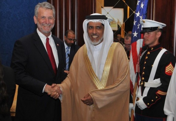 لكنه في 6 مايو، يحضر في عقر دار السفارة الامريكية المتآمرة والمخططة والمدبرة لتغيير الهوية بأيد صفوية، ويظهر في الصور التي نقلتها وكالات الأنباء مرتدياً (بشت) الفخامة، ومصافحاً السفير الامريكي بابتسامة عرضها كعرض الخليج المخطط لتغيير هويته!