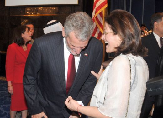 في اليوم التالي مباشرة، أي في 6 مايو، كانت سميرة رجب تتقدّم بابتسامة مشقوقة (لا ممشوقة) من الصدغ إلى الصدغ، في حفل السفارة الامريكية، ظهرت خلال الصور التي بثتها وكالات الأنباء، وهي تبالغ بشكل مفتعل في ملاطفة ومضاحكة السفير الامريكي، كما شاركت في تقطيع الكعكة الخاصة بالمناسبة.