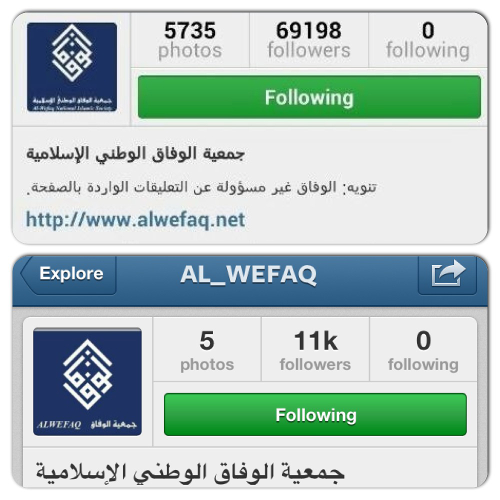 وأكدت "الوفاق" أنها لا تتحمل مسؤولية أي تعليق أو صورة ترد على الصفحة المغلقة، داعية إلى متابعة صفحتها الجديدة "Al_wefaq" على "إنستغرام".