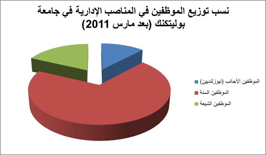 بالإضافة إلى المدرسين الأجانب، تم تهميش ونقل 9 موظفين بين مدير ومسئول ومختص، ينتمون جميعهم إلى طائفة معينة، بهدف إقصاء الموظفين "الشيعة" من مراكز القرار والسيطرة على جميع أقسام الكلية، وبذلك تغيرت تركيبة المناصب الإدارية والوظيفية لا من أجل المهنية بل من أجل إحلال طائفة بدل أخرى، وتظهر الرسوم البيانية سيطرة طائفة معينة على جميع الوظائف في الكلية، بعد انتقالها لإدارة وزارة التربية، تحقيقا لأهداف الخوالد البندرية.