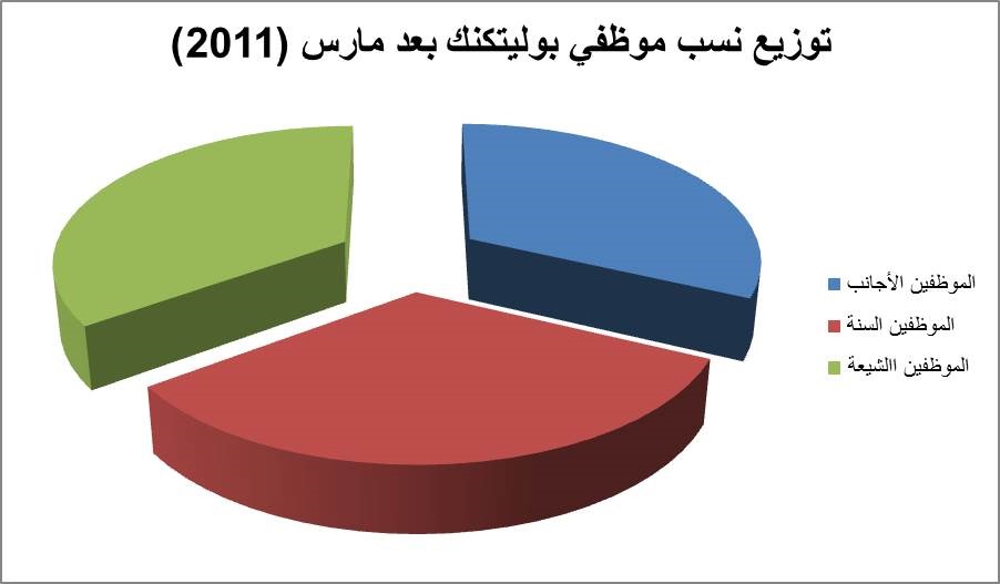 كلية بوليتكنك، شأنها شأن جميع الوزارات التي طالها التطهير الطائفي، وكغنيمة حصلت وزارة التربية عليها تم توظيف أكثر من 80 موظفا من طائفة واحدة خلال العشرة شهور الأولى من استلام وزارة التربية الإشراف عليها. جميع من تم تعيينهم يفتقدون إلى الكفاءة والمؤهلات، فهم إما خريجو ثانوية عامة أو طلاب جامعة أو متقاعدون أو عسكريون أو محولون من وزارة التربية والتعليم، وبالرغم من أنهم لا يمتلكون المهارات اللازمة صاروا يتنقلون من وظيفة إلى وظيفة أعلى، كما صارت فرص التدريب في بوليتكنك أغلبها حكرا عليهم.