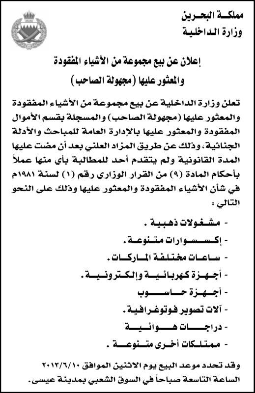 مرآة البحرين: بعدما سرقتها قوات الأمن البحرينية من المنازل خلال مداهمتها، أعلنت وزارة الداخلية بيع "مجموعة من الأشياء المفقودة مجهولة الصاحب والمعثور عليها في الإدارة العامة للمباحث الجنائية، وذلك عن طريق المزاد العلني".