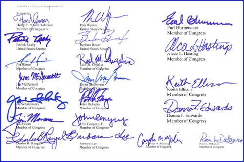 والموقعون على الخطاب هم: هانك جونسون (عضو في الكونغرس)، جان تشاكوسكي (عضو في الكونغرس)، رون وايدن (سناتور)، بيتر ديفازيو (عضو في الكونغرس)، باتريك ليهي (سناتور)، جيم موران (عضو في الكونغرس)، باربرا بوكسر (سناتور)، جون كونيرز جونيور (عضو في الكونغرس)، جيم هايمز (عضو في الكونغرس)، شارلز ب. رانغل (عضو في الكونغرس)، راوول غريالفا (عضو في الكونغرس) باربرا لي (عضو في الكونغرس)، جيم ماكديرموت (عضو في الكونغرس)، كارولين مالوني (عضو في الكونغرس)، جيمس ماكغوفرن (عضو في الكونغرس)، روزا ديلاورو (عضو في الكونغرس)، ايرل بلومينور (عضو في الكونغرس)، كيث ايليسون (عضو في الكونغرس)، السي هاستينغ (عضو في الكونغرس) ودونا ادواردز (عضو في الكونغرس).