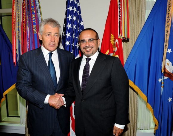 والتقى هيجل أمس الجمعة ولي العهد سلمان بن حمد آل خليفة، الذي يزور واشنطن، وأكد دعمه "الواضح" للأمن والاستقرار في البحرين، مشيرا إلى أن الإصلاح السياسي المستدام والمجدي واحترام حقوق جميع المواطنين هو السبيل الوحيد لبحرين مستقرة.
