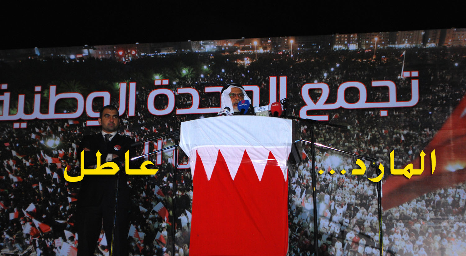 وفي الساحة نفسها وقف الشيخ حسن الحسني، مهدداً بأنه سيخرج من البحرين إلى السعودية متوجهاً إلى أبي متعب الملك عبدالله(، في حال تمّ العفو من قبل الملك عن حسن مشيمع. الاعتراف يعني في مفهوم التجمع الوطني استمرار الحرب على هذا المكون الخائن، ولو بأسلحة أخرى غير سلاح ذراع الجزيرة. هكذا إذن، طاولة الحوار، والعفو، يهددان هذا الاعتراف.